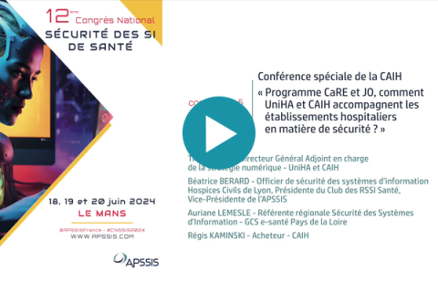 Intervention le 18 juin 2024 de CAIH lors du congrès de l'Apssis aux côtés du club des RSSI et du GCS e-santé Pays de la Loire avec comme sujet phare "Le programme hashtag#CaRE et les JO, comment UniHA et CAIH accompagnent les établissements hospitaliers en matière de sécurité".